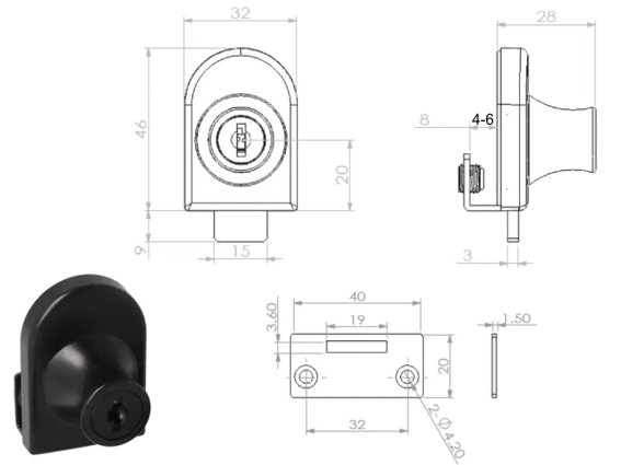 Zámek slouží k uzamykání jednoho křídla skleněných dveří bez nutnosti vrtání otvoru do skla.